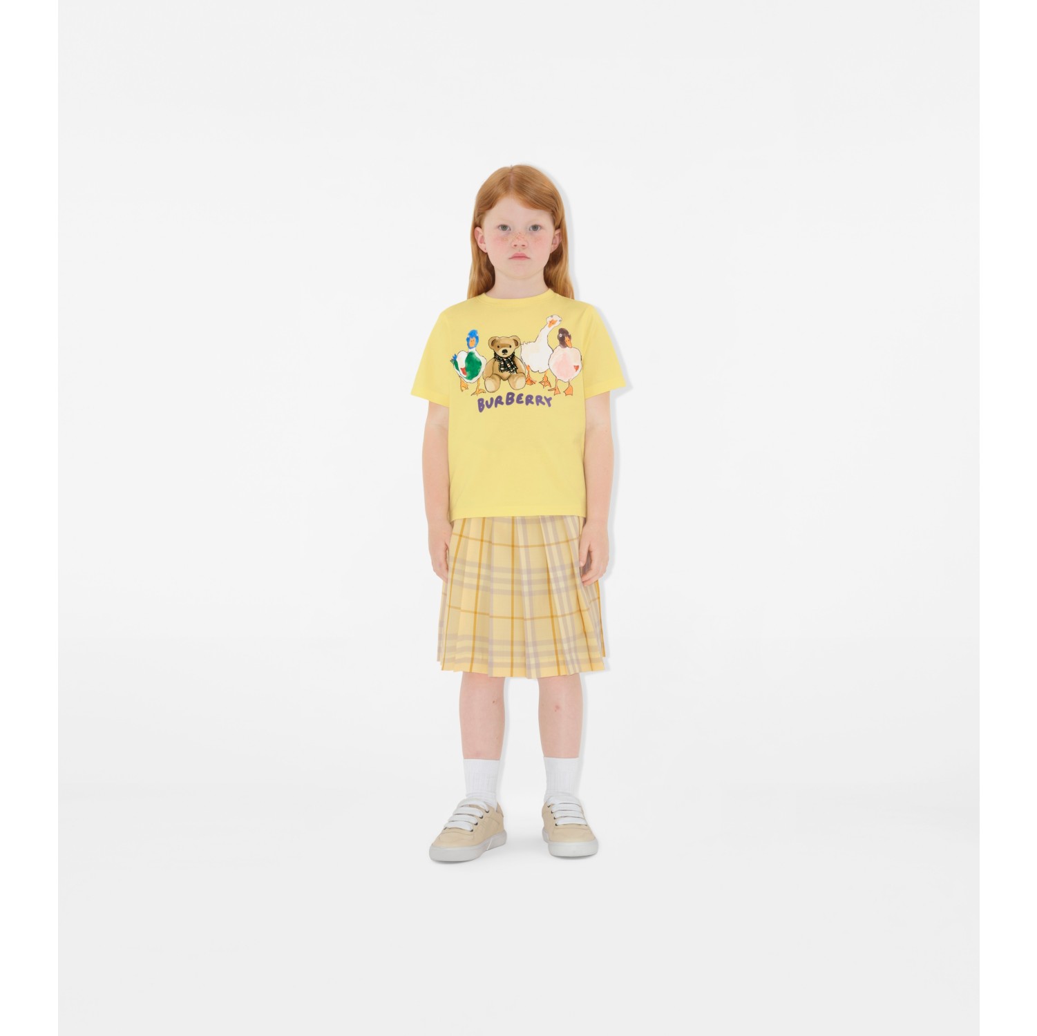 圆领 T 恤衫,选用平织棉面料打造。正面和背面均装饰手绘图案印花,生动描绘 Thomas 泰迪熊及其朋友的玩趣画面。融入植绒 Burberry 字母徽标,彰显品牌元素。